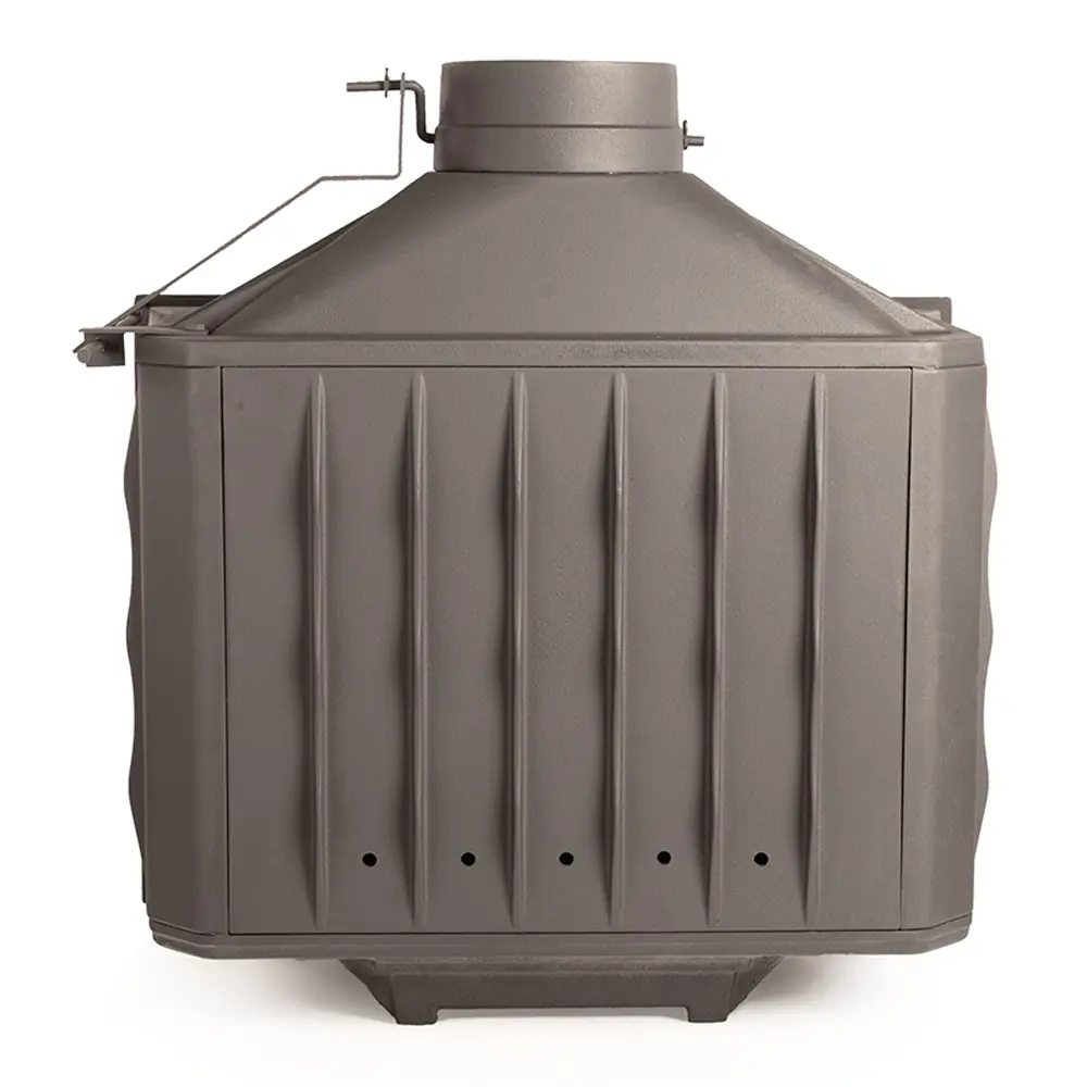 Каминная топка Ilma закрытого типа с верхним подключением к дымоходу изготавливается на российском заводе «FireWay» и пользуется высоким потребительским спросом благодаря высокому качеству, эффективности и удобству в эксплуатации. К тому же производителю удалось предложить покупателям оптимальную цену за действительно долговечный и функциональный отопительный прибор (гарантия составляет 5 лет от даты приобретения). Модель предназначена для отопления помещений объемом до 280 куб.м. Обогрев происходит путем конвекции поступающего через имеющиеся в нижней верхней части топки отверстия и передаваемым теплом через ее чугунные части и панорамное огнеупорное стекло.
