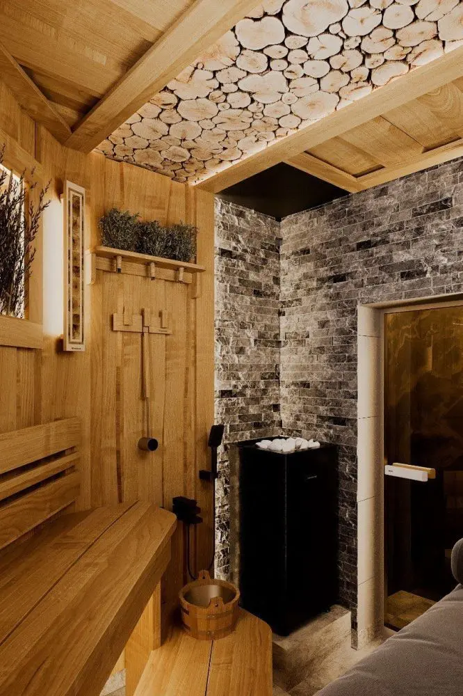 Тёмный стиль бани обеспечит полное погружение в таинство парения. Баня, наполненная паром, ароматами можжевельника, кавказских трав и фруктовых деревьев подарит незабываемые эмоции. Изюминкой данного проекта является потолок в виде солнца с лучами, визуально увеличивая пространство.